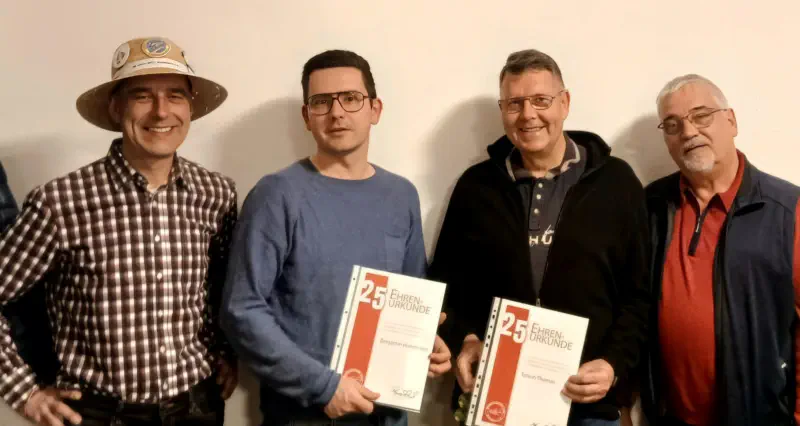 Bei der Mitgliederversdammlung wurden Benjamin Himmelein und Edwin Thomas für 25-jährige Mitgliedschaft beim MFC mit einer Urkunde geehrt.