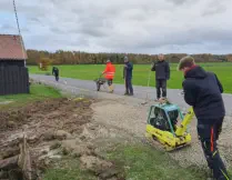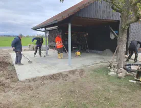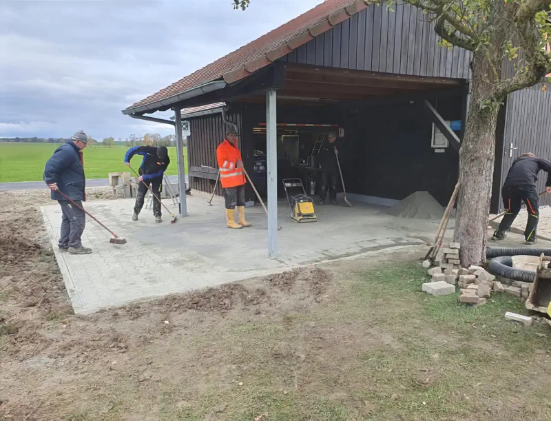 Auch das Pflaster der Terrasse wurde vergrößert, in der Einfahrt zum Platz eine Trainage verlegt und die notwendige Höhenangleichung der Einfahrt zur neuen Teerdecke der Straße mit Schotter aufgefüllt.